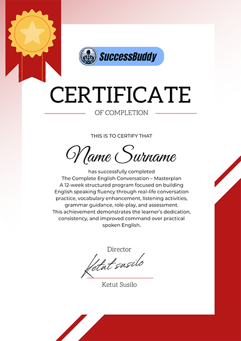When you complete our course, you don’t just walk away with better English — you earn a Certificate of Completion from Success Buddy.